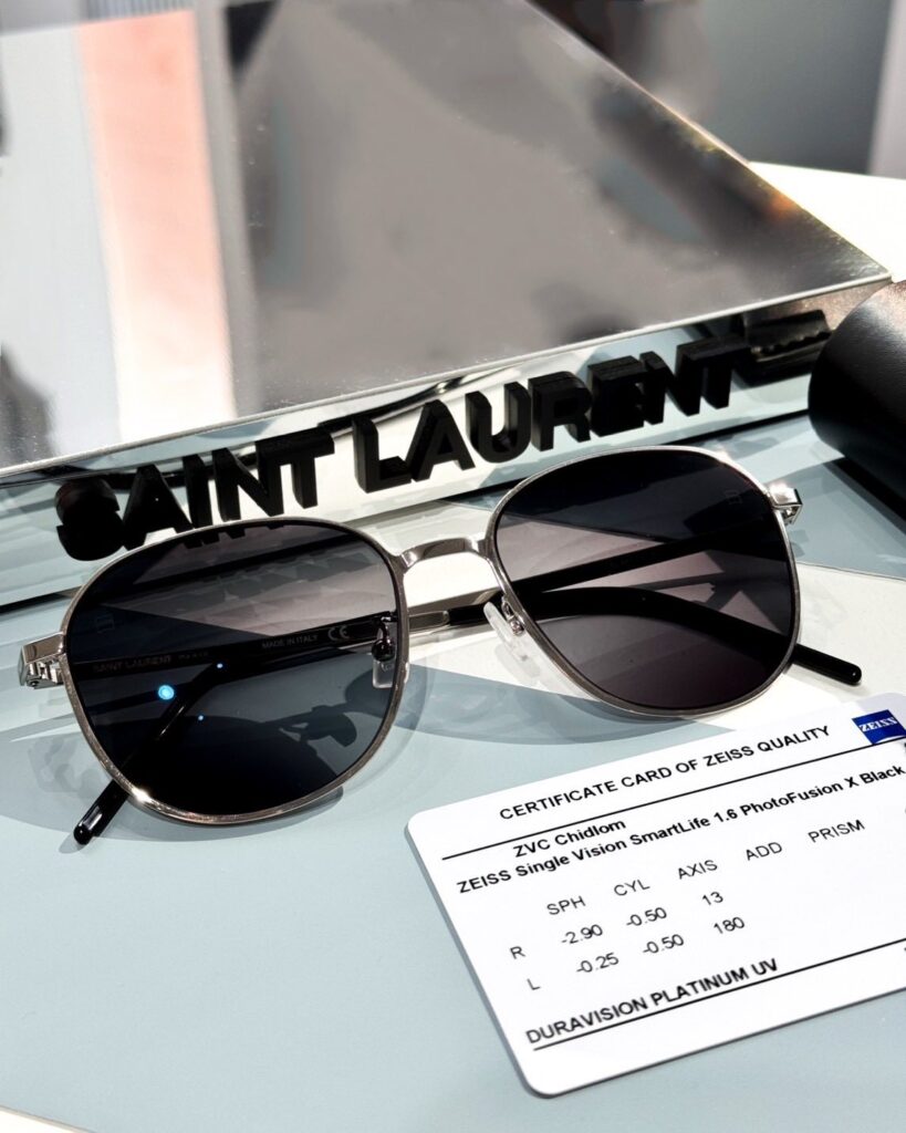 เลนส์ที่แนะนำในครั้งนี้คือ ZEISS 1.60 SmartLife Single Vision PhotoFusion X Black DuraVision Platinum (LAB) เป็นเลนส์ที่มีการขัดละเอียดแบบ Customized Freeform และใช้ค่าพารามิเตอร์ของแว่นขณะสวมใส่บนใบหน้าลูกค้ามาใช้ในการขัดเลนส์ ได้แก่ มุมเทหน้าแว่น (Pantoscopic Angle) ทำให้เลนส์มีมุมมองที่คมชัดและภาพบิดเบือนด้านข้างน้อยที่สุดครับ เพิ่มความสบายตาด้วยเลนส์ออกแดดเปลี่ยนสี PhotoFusion X ที่เปลี่ยนเป็นสีดำ (Black) เป็นเทคโนโลยีใหม่ล่าสุดที่เลนส์จะเปลี่ยนสีได้เร็วและเข้มขึ้นกว่าเดิม ป้องกันสีรัง UV ที่เป็นอันตรายต่อดวงตาขณะอยู่กลางแจ้งได้เป็นอย่างดีครับ