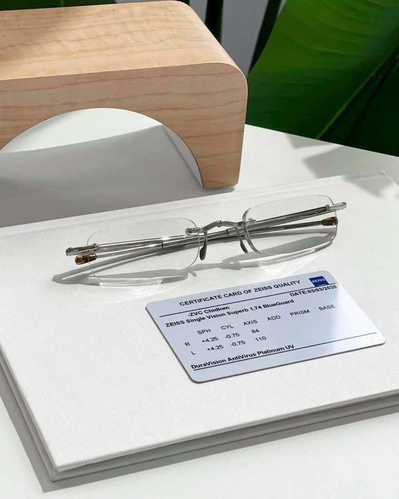 เลนส์ที่แนะนำคือ ZEISS 1.74 Single Vision Superb BlueGuard DuraVision AntiVirus Platinum UV (LAB) เป็นเลนส์ที่มีการขัดละเอียดแบบจุดต่อจุดด้วยเทคโนโลยี Freeform เพื่อลดภาพบิดเบือนด้านข้างของเลนส์