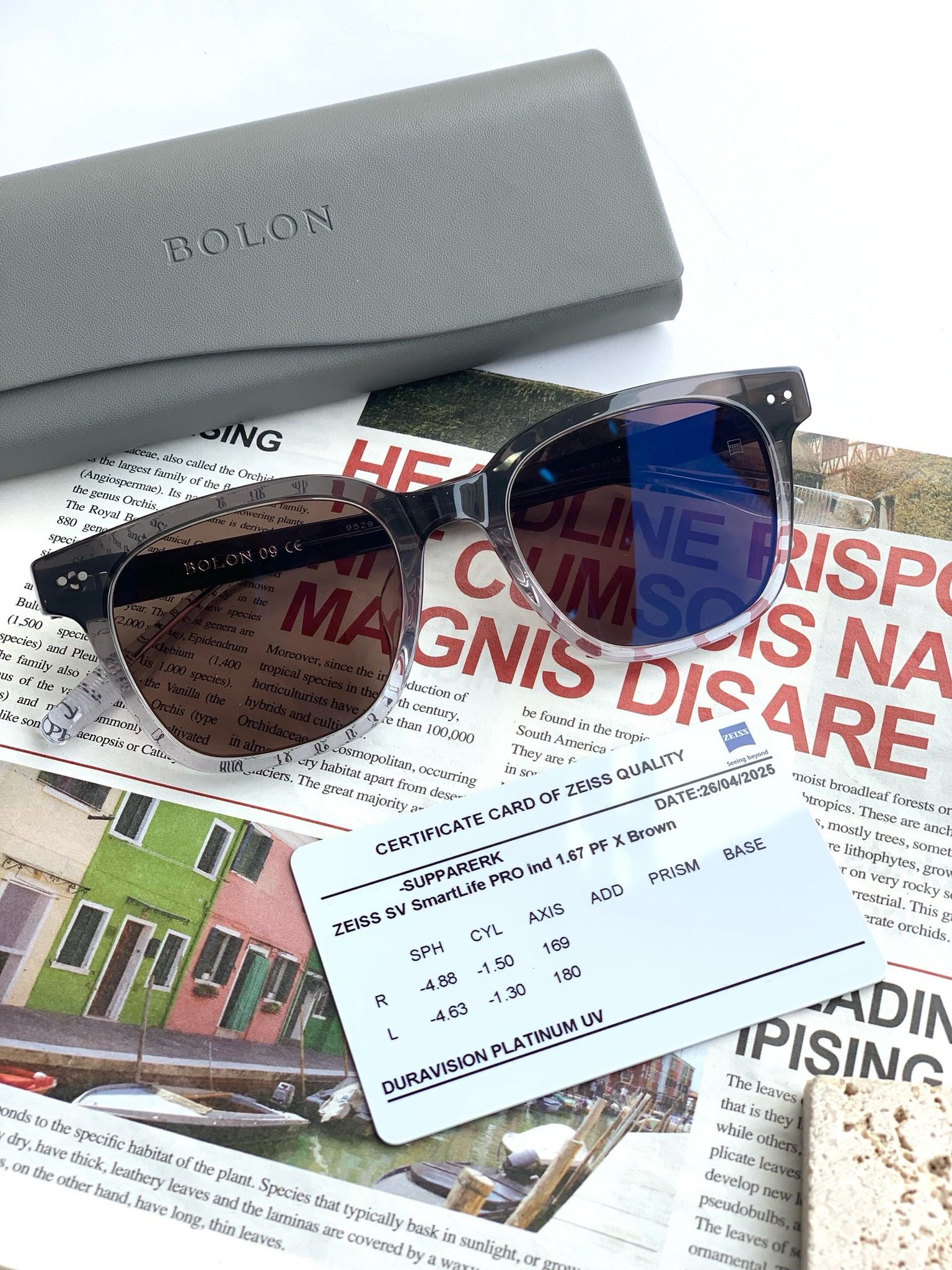 เลนส์ที่แนะนำสำหรับลูกค้าเคสนี้ เป็น ZEISS 1.67 SmartLife PRO Single Vision Individual PhotoFusion XBrown DuraVision Platinum (LAB) จากประเทศเยอรมัน เป็นเลนส์เฉพาะบุคคลที่ดีที่สุดที่มีการขัดละเอียดแบบ Customized Freeform และใช้ค่าพารามิเตอร์ของแว่นขณะสวมใส่บนใบหน้าลูกค้ามาใช้ในการขัดเลนส์ ได้แก่ ความโค้งหน้าแว่น (Wrap Angle), มุมเทหน้าแว่น (Pantoscopic Tilt Angle) และระยะห่างตากับเลนส์แว่น (Back Vertex Distance) ทำให้เลนส์มีมุมมองที่คมชัดและภาพบิดเบือนด้านข้างน้อยที่สุด