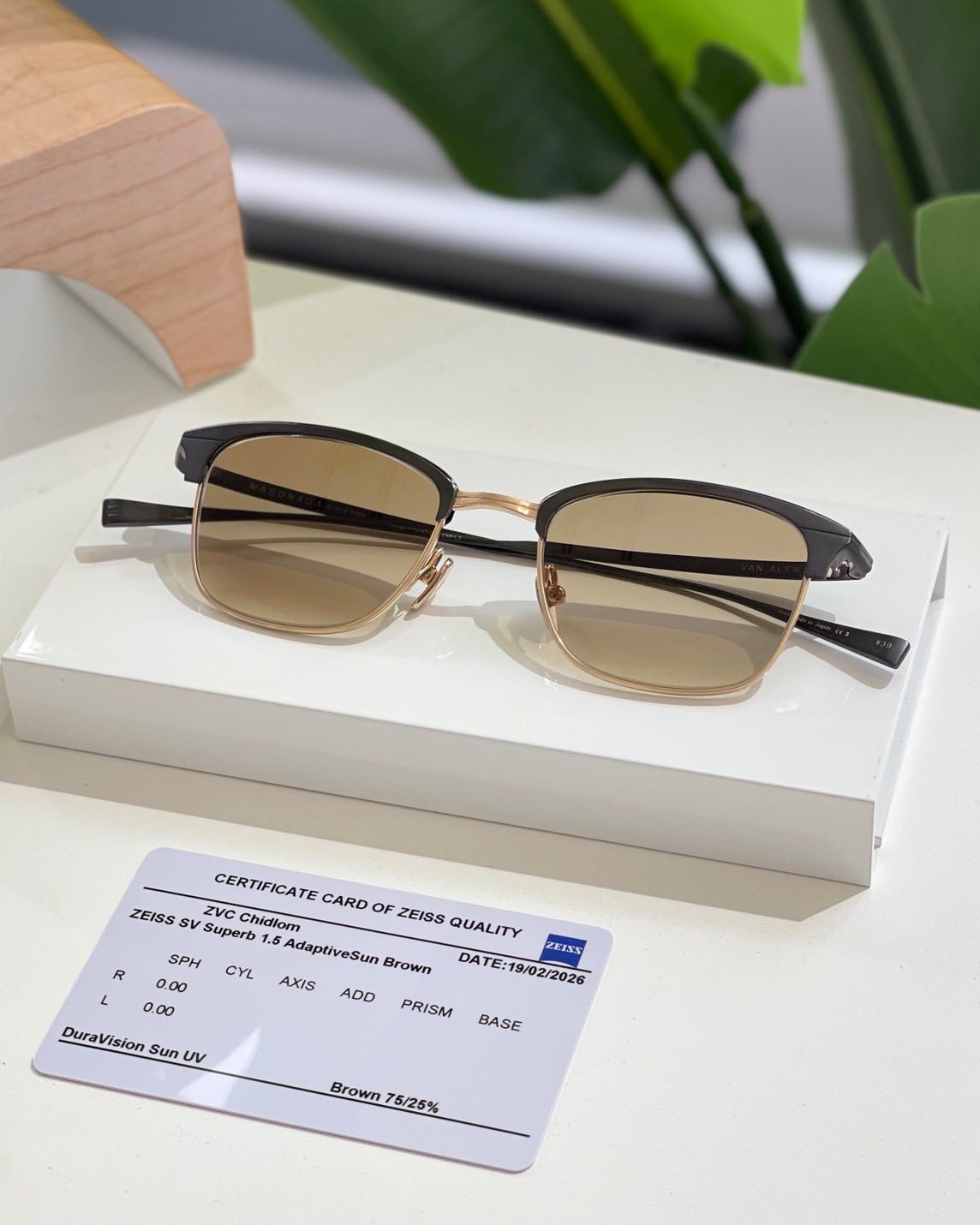 เลนส์ที่ร้านแนะนำ ZEISS 1.50 Single Vision Superb AdaptiveSUN Gradient Brown 75/25 ลูกค้าได้เลือกเป็นเลนส์ที่ย้อมสีน้ำตาลไล่ระดับเข้มไปจาง และปรับสีเข้มขึ้นอัตโนมัติเมื่อเจอแสงยูวี โดยเลนส์จะย้อมสีที่ระดับความเข้ม 60% เมื่ออยู่ในที่ร่ม และจะปรับสีเข้มขึ้นสูงถึง 97%