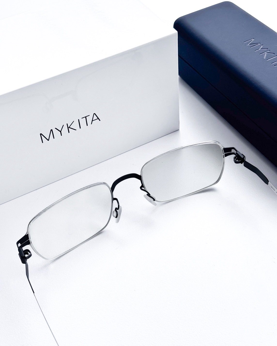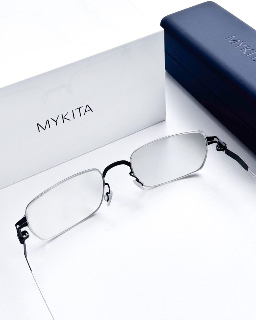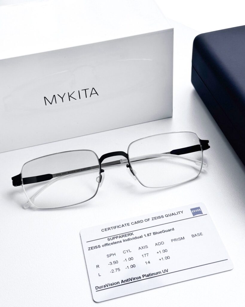 กรอบแว่นลูกค้าเลือกแบรนด์ Mykita ASGER ตัวเฟรมจะเป็น สีน้ำเงิน (Indigo/Navy) ซึ่งเป็นโทนสีที่ให้ความรู้สึกสุขุม นิ่ง เมื่อรวมกับทรงสี่เหลี่ยมผืนผ้า และดีไซน์แบบ LESSRIM ที่บางเฉียบ สีน้ำเงินโทนนี้จะช่วยขับใบหน้าให้ดูสว่างขึ้นและดูมีความเป็นแฟชั่นที่ใส่ใจในรายละเอียด น้ำหนักเบามาก สวมใส่สบาย