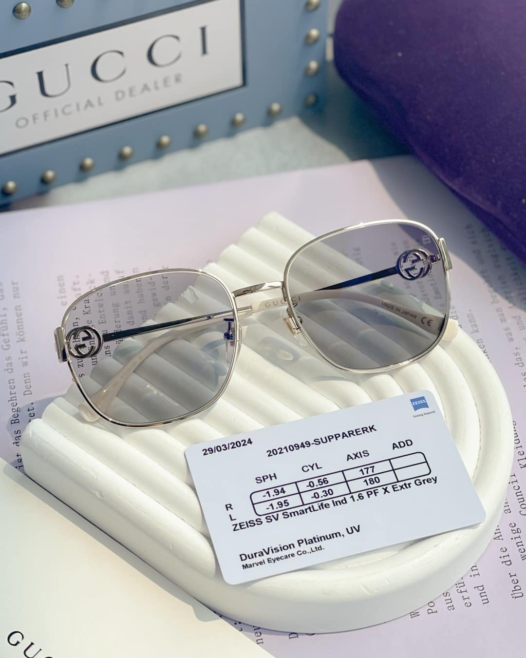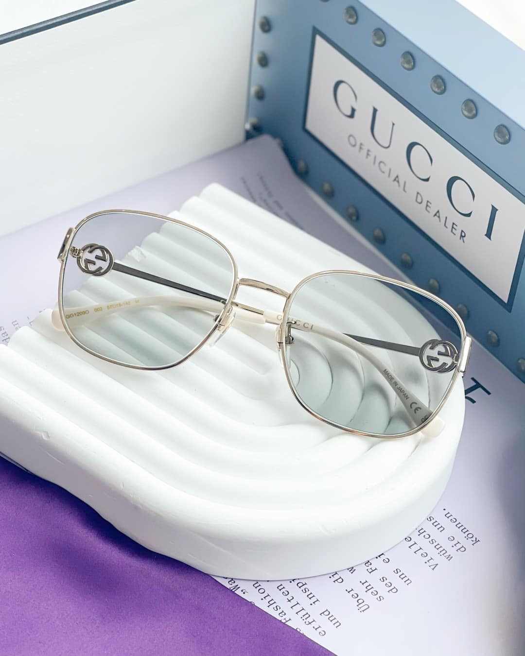 กรอบแว่นเลือกเป็นกรอบแว่น Gucci รุ่น GG1209O-002 แบรนด์หรูที่มีชื่อเสียงมายาวนานจากอิตาลี ด้วยวัสดุที่แข็งแรง ทนทาน และมาพร้อมกับขาที่เป็นเอกลักษณ์อย่างตัวอักษร “GG” ที่ดีไซน์ออกมาเป็นไอคอนนิคอย่างนึงของ Gucci ที่ใครเห็นก็จะทราบได้ในทันที ด้วยรูปทรงกรอบเหลี่ยมด้านหน้า ทำให้เหมาะกับรูปหน้าหลากหลายแบบ สีทองที่จะทำให้หน้าของผู้สวมใส่ดูโปร่ง ดูสว่างมากยิ่งขึ้น เข้าได้กับทุกชุดการสวมใส่ทั้งเป็นทางการ แฟชั่นสดใส หรือชุดเรียบหรู