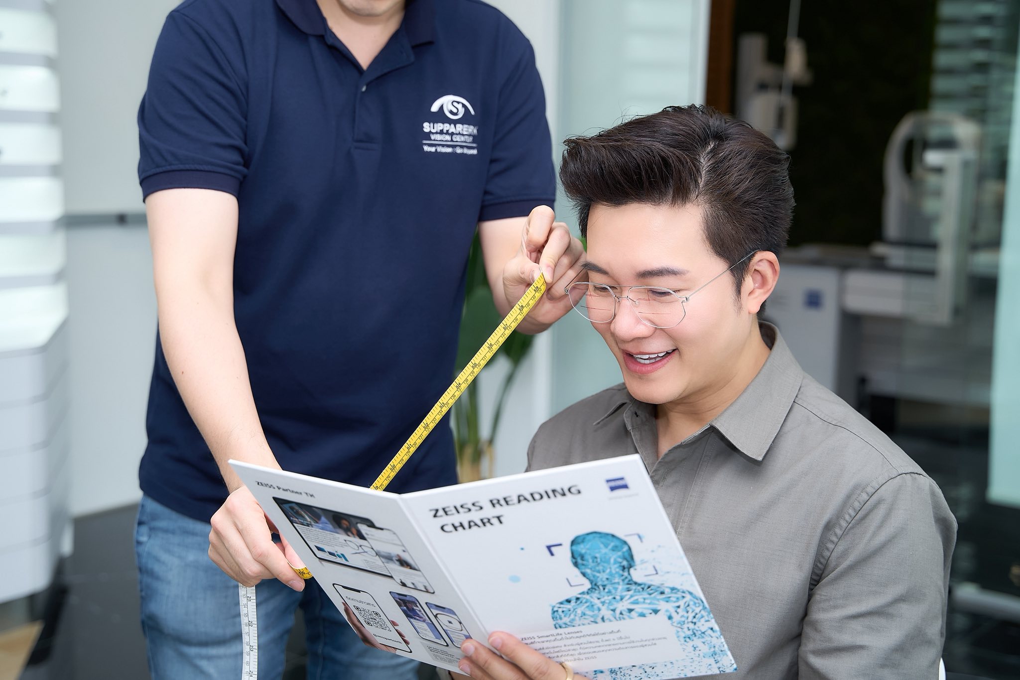 เคสนี้ลูกค้าอายุ 24 ปี เป็นลูกค้าเก่าที่เคยตัดแว่นกับทางร้านเมื่อ 2 ปีที่แล้ว กลับเข้ามาเช็คสายตาประจำปีเนื่องจากแว่นเดิมรู้สึกว่าความคมชัดลดน้อยลง บางครั้งต้องเพ่งหรือหรี่ตามากขึ้น ทำให้มีอาการตาล้า ปวดกระบอกตาในช่วงเวลาทำงานนาน ๆ โดยลูกค้าต้องทำงานกับคอมพิวเตอร์ตั้งโต๊ะและโทรศัพท์มือถือ วันละ 10 ชั่วโมง/วัน รวมทั้งลูกค้าต้องการแว่นใหม่ที่ให้บุคลิกที่ดูสดใส และเป็นแฟชั่นมากขึ้นครับ