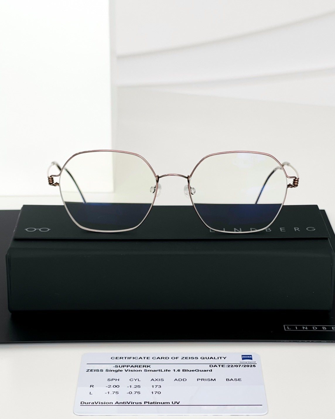 ลูกค้าเลือกเป็นเลนส์ ZEISS 1.60 Single Vision Superb BlueGuard DuraVision AntiVirus Platinum UV (LAB) เป็นเลนส์ที่มีการขัดเลนส์อย่างละเอียดช่วยให้มุมมองภาพบิดเบือนด้านข้างลดน้องลง ภาพดูเป็นธรรมชาติมากขึ้น และยังมีเทคโนโลยี SmartLife ที่คำนวณการหดขยายรูม่านตาตามแต่ละช่วงวัย ให้สอดคล้องกับการใช้งานสำหรับคนที่ทำอุปกรณ์ดิจิตอลเป็นประจำ