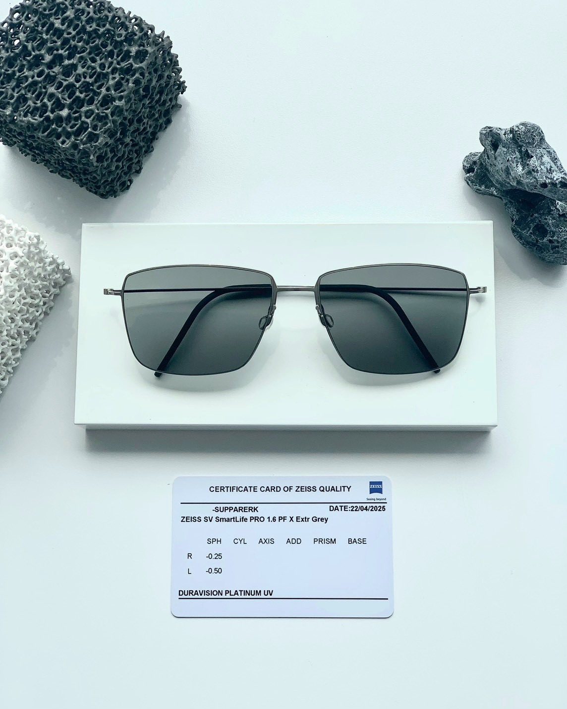 เคสนี้เลนส์ที่ลูกค้า เลือกใช้คือ ZEISS 1.60 SmartLife PRO Single Vision PhotoFusion X Extra Grey DuraVision Platinum UV (LAB) เลนส์เฉพาะบุคคลที่ใช้การขัดเลนส์แบบ Customized Backside Freeform ที่ช่วยให้ค่าสายตาเสถียรทั่วทั้งผิวเลนส์ ทำให้คนที่มีปัญหาสายตาสั้นและเอียงมองเห็นภาพได้อย่างเป็นธรรมชาติมากยิ่งขึ้น เหมาะกับลูกค้าที่ใช้สายตาทั้งวัน พร้อมทั้งคำนวณค่าพารามิเตอร์กรอบแว่น ค่ามุมเทหน้าแว่น (Panto Scopic Tilt) ความโค้งหน้าแว่น (Wrap Angle) จึงทำให้ตัวเลนส์เหมาะสมกับค่าสายตาของลูกค้า
