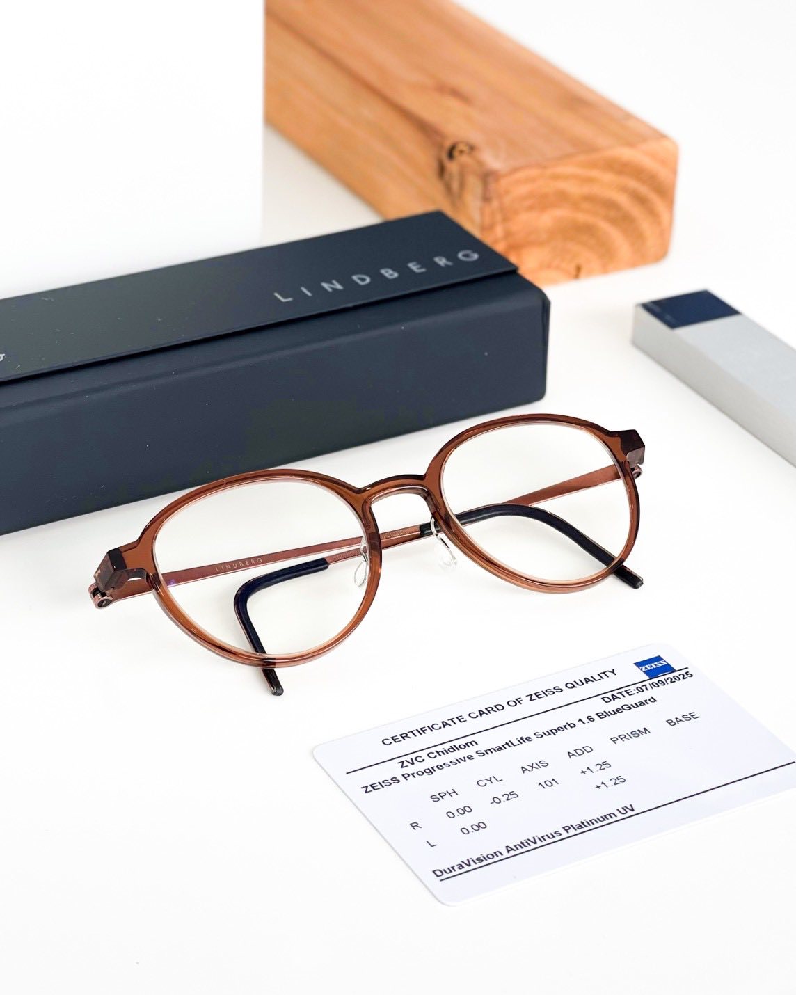 กรอบแว่นลูกค้าเลือกเป็น Lindberg รุ่น Acetanium 1176 47-19,209,135,AL07,K162-PU12 แว่นคุณภาพสูงจากเดนมาร์ก ด้านหน้าเป็นอะซิเททเกรดพรีเมี่ยมสีน้ำตาลแดง ที่มีจุดเด่นในด้านน้ำหนักที่เบามาก ตอบโจทย์คนที่มีปัญหาเรื่องแว่นหนักหรือคนที่ต้องใส่แว่นตาตลอดทั้งวันครับ ด้วยวัสดุของขาแว่นที่ทำจากไทเทียมเนียมคุณภาพสูง ทำให้มีน้ำหนักเบาแต่ยังคงความแข็งแรงทนทาน