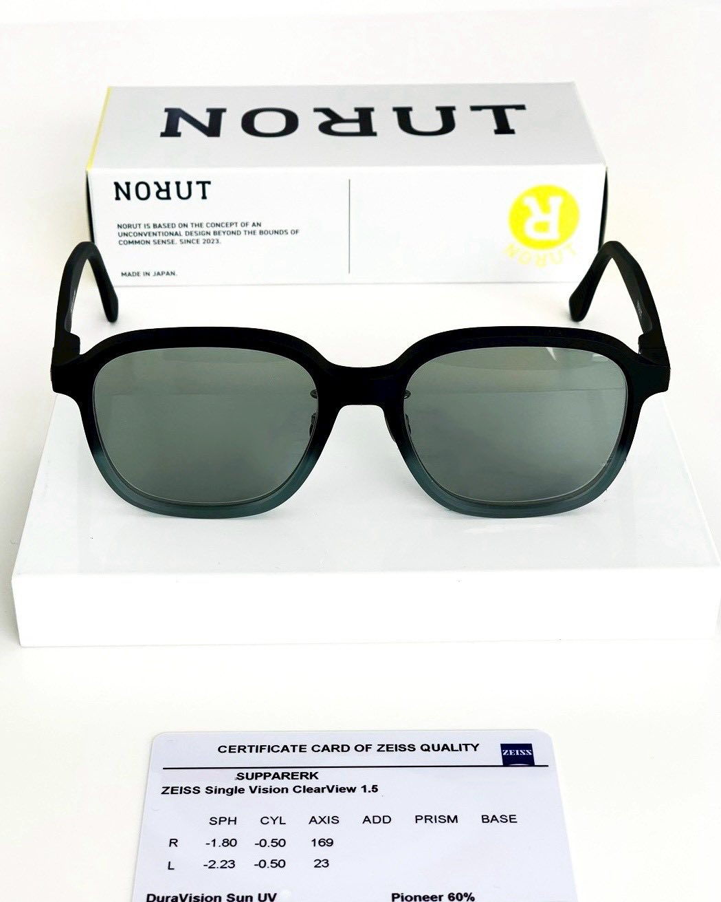 กรอบแว่นลูกค้าเลือก Norut รุ่น ANIE C03 52 แว่น Handcrafted จากประเทศญี่ปุ่น กรอบแว่นด้านหน้าผลิตจาก TROGAMID ซึ่งเป็นวัสดุไนลอนเนื้อแน่นที่ผลิตในเยอรมัน และขาแว่นทำจาก TR90LX ซึ่งเป็นพลาสติกวิศวกรรมที่มีความยืดหยุ่นและปรับได้ง่ายที่ผลิตในประเทศสวิสเซอร์แลนด์ คุณสมบัติที่โดดเด่นที่สุดของวัสดุคือความเบา วัสดุทั้งสองมีความทนทานและทนทานต่อความมันและเครื่องสำอาง นอกเหนือจากแรงกระแทก รังสีอัลตราไวโอเลต และการเสียดสี และยังใช้ในอุปกรณ์ทางการแพทย์อีกด้วย