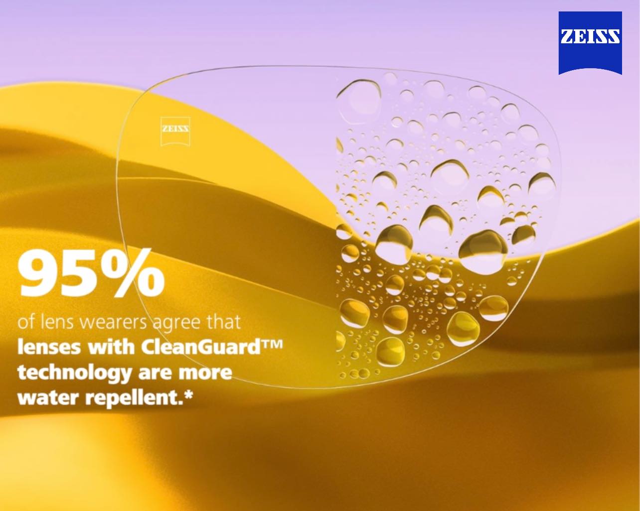 ZEISS CleanGuard Technology at Supparerk Vision คือนวัตกรรมพื้นผิวเลนส์ระดับไฮเอนด์ที่ยกระดับมาตรฐานความใสกระจ่างด้วยวิศวกรรมการออกแบบชั้นเคลือบให้มีค่า Contact Angle สูงถึง 117 องศา ส่งผลให้เกิดปรากฏการณ์น้ำกลิ้งบนใบบัวอย่างสมบูรณ์ มวลน้ำจะควบแน่นเป็นทรงกลมและไหลหลุดออกจากผิวเลนส์ในทันทีโดยไม่ทิ้งคราบรบกวนสายตา แม้ต้องเผชิญกับละอองฝนหรือความชื้นในสภาวะต่างๆ